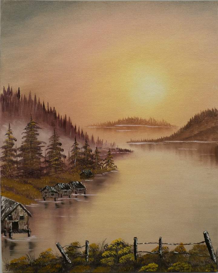 In this painting no bravery test as a big tree. In stead of that a clear view over the lake with the little fishermans cabins. Because Bob was overpainting some of them I made the houses not too big to have sufficient space. The last pole of the fence I added within the border, because I skipped the frame with contact paper. On canvasboard 24x30 cm.