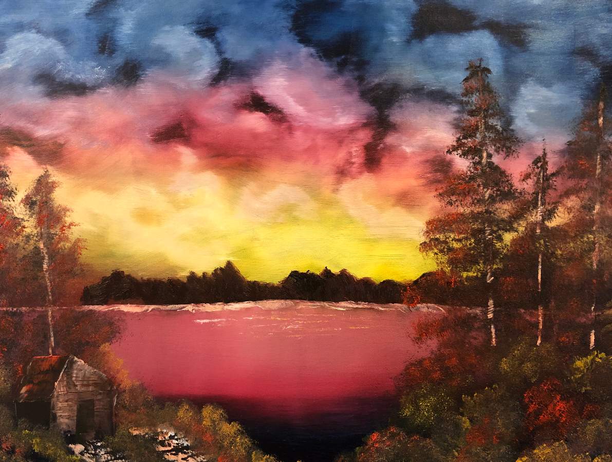 Oh, I loved this one! Tricky color placement, but it went fairly fast (I painted it in one day, whereas it usually takes me two to three). This is one I’d like to try again with some lessons-learned; mainly more yellow in the foreground/lake reflection. I’d also change the foothill color- my mix of al crimson and black made brown and I liked the more violet look in the real version. Might add in some pthlalo. Same with the tree silhouette- I want the color cooler, I think?