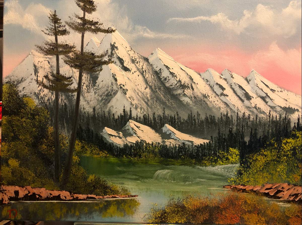 Not crazy about this one. I don’t like the clouds or the highlights. I also tried to be slick and drop in some reflections from the highlights and then tried to put in waterlines with the fan brush like Bob did and messed it all up. So I covered it up with some foreground bushes.