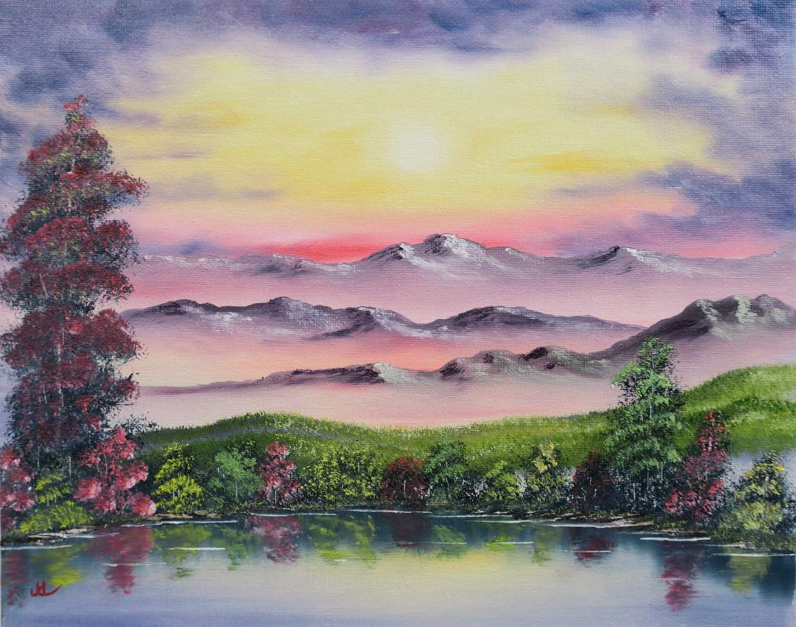 I do not on speedpainting, but this was a quick one: within 2 hours. Added a hotspot for the sun and tried to use more natural colors for the hills in stead of the purple Bob was using. On canvasboard 30 x 24 cm.