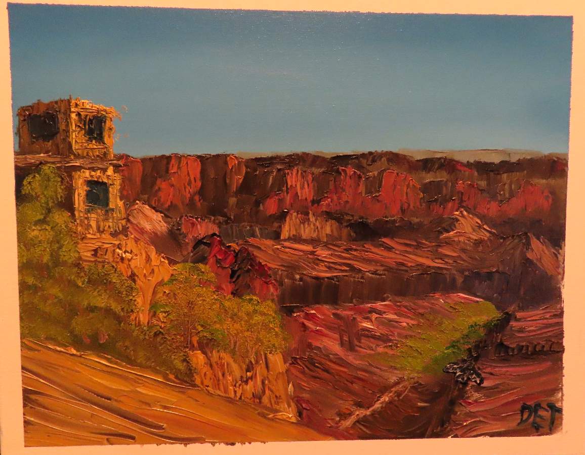Painted on a 20 x 16 canvas. Having recently gone out to Arizona and Utah I was inspired by a photo I took looking towards Lookout Studio from the west by Bright Angel Lodge. It was a challenge to capture the depth and beauty of the scene but I tried my best. It is tough to do the Grand Canyon justice in paintings or photographs. I even caught a California Condor in the Photo and added it to the painting. After looking at my photo again to try to identify the condor by tag I noticed I caught another one, but they are difficult to paint and it will not be included in the painting.