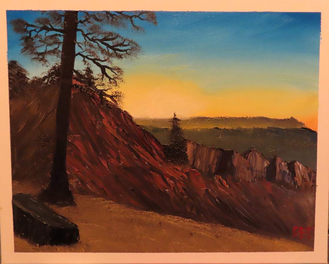 Painted on a 20 x 16 canvas. My Version of Soft Mountain Glow is based off of a photo I took of Sunrise at Bryce Canyon from around Sunrise Point. I normally do not wake up before the sunrises, but for one day it was worth it. I thought the hoodoos might be too challenging to try, so I went with the sunrise. The gentle blending Bob used was something I had to do here.