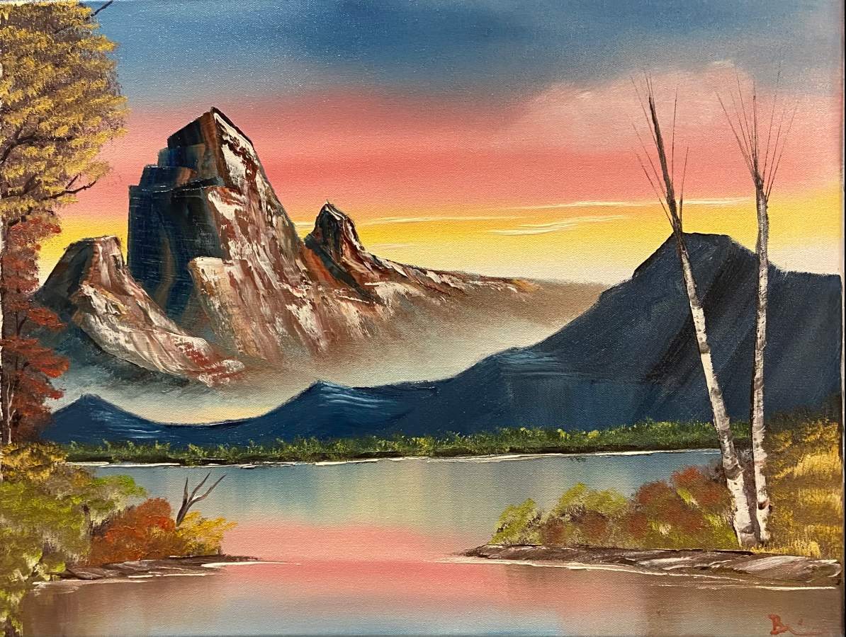 I used liquid white instead of liquid clear on this one by mistake. Another problem is I have the main mountain too far to the left so only had room for a piece of 1 tree. Other than that I am happy with this painting. 18x24