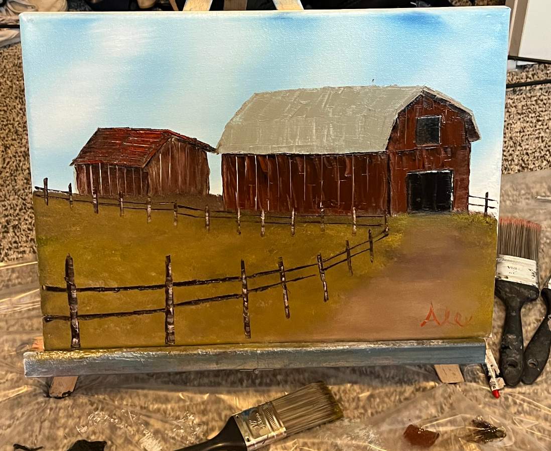 This is so good! The fence is outstanding (outstanding in its field! Ha!) and you really got the appearance of depth. If I had to give any constructive criticism it would be that the barn on the left could use a slight barnectomy on the bottom left corner. Having the ground cover up just a tad more of that corner might make it look a little more 3D. Overall I think you nailed it, and anyone would be proud to hang this in their home.