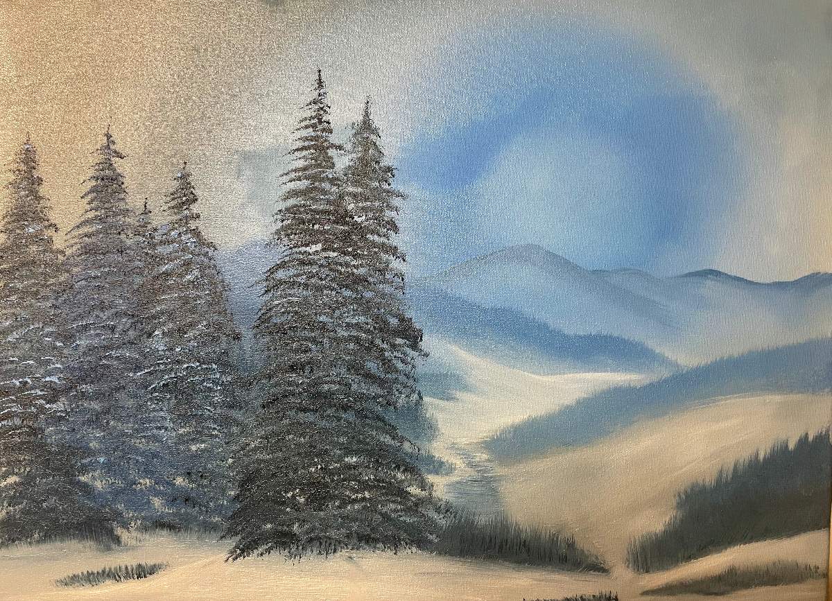 You certainly have the depth down. Your evergreens look very good for 2 weeks experience. They look like you have painted hundreds of them.