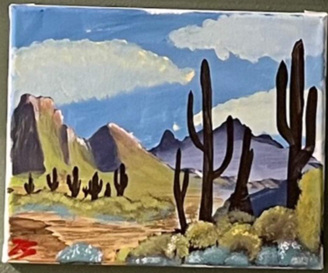 I think you did a really good job on this painting! I like the mountains and cliffs, the cactus and the rocks. You did a good job creating some depth. And acrylics are difficult to do this method. I do you agree that the clouds are a little bit too much for the sky. The good thing about acrylics is you can always go over it again once it is dry and change it if you want.