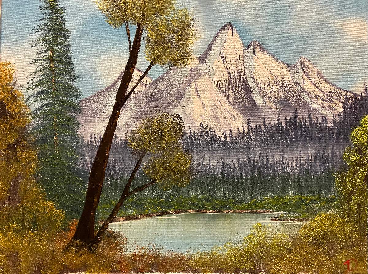 I went with a more traditional mountain and omitted the land part in the foreground. I wish my highlights on the tree in the foreground was more pronounced and I feel like my distant foothill trees are too uniform. Overall, I don’t hate it.