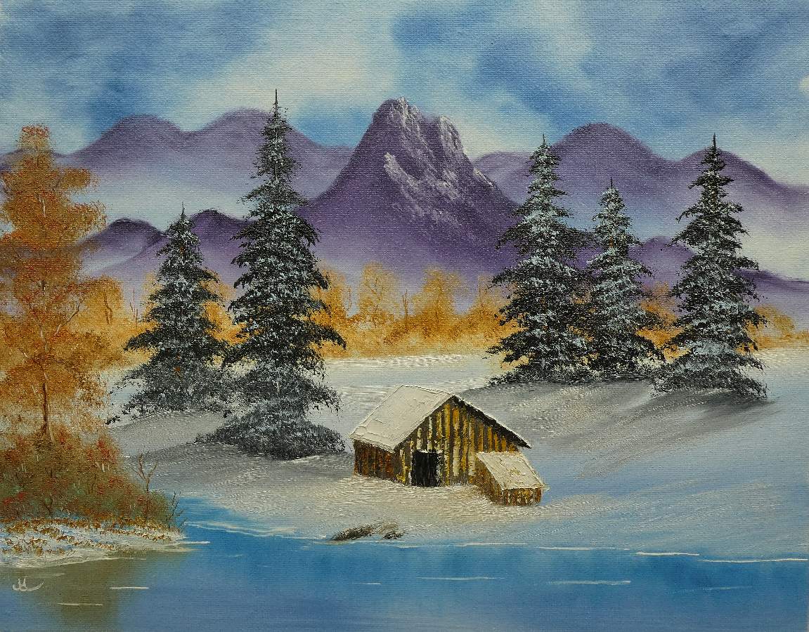 A different painting, because there are no painted clouds in the sky, just blended white spaces, almost no highlight on the mountains, distant trees in yellow ochre without highlight and a cabin with wider wooden planks, this scene is sometimes mentioned as one of the most ugly Bob Ross paintings, but I liked this scene to paint, the shadows of the trees I liked the most, on canvasboard 30 x 24 cm.
