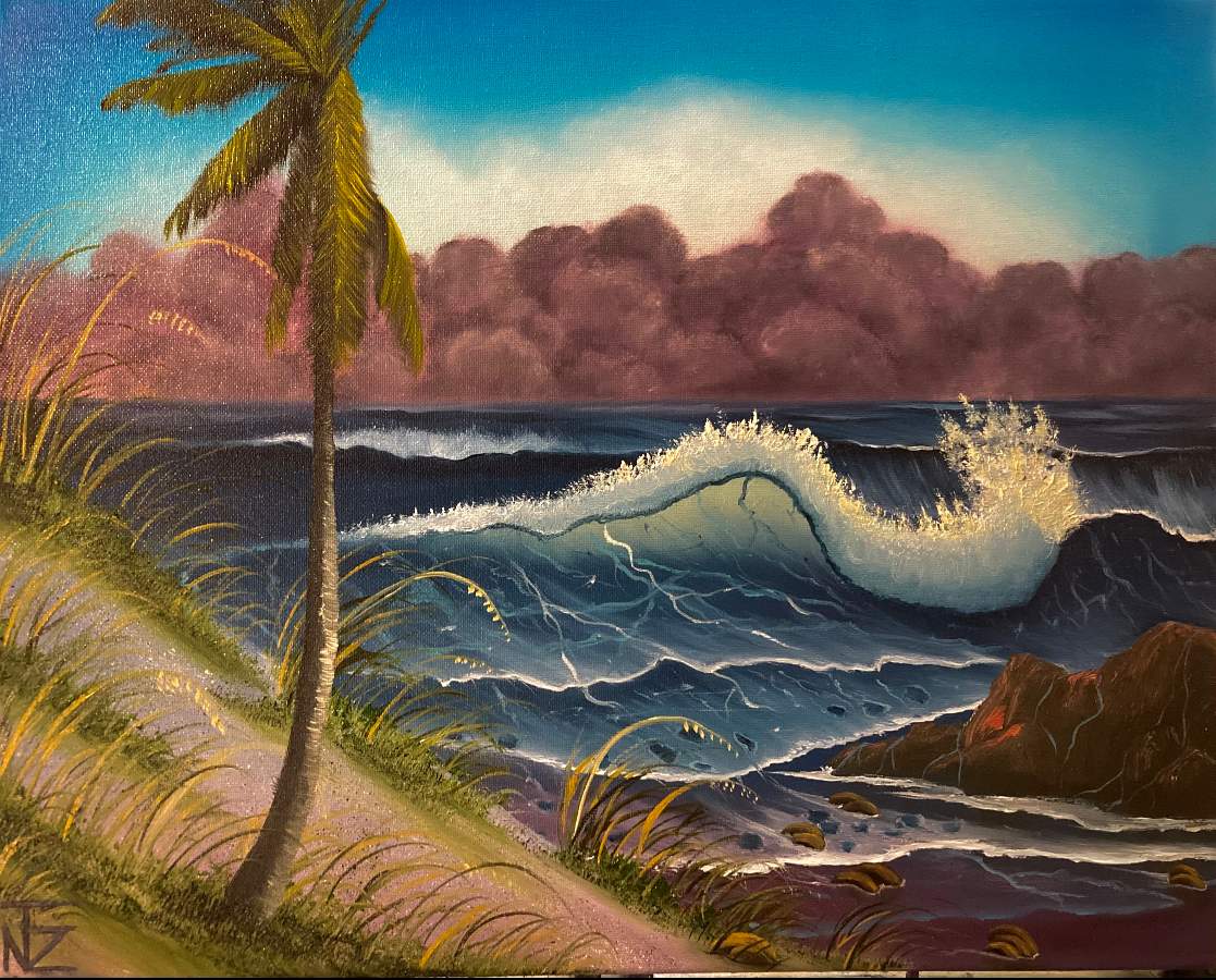 My clouds look like grapes π! πππ I was too lazy to get my book so I went with the video. Bob puts dark purple clouds. In the book, they are a lot more subtle and far away in the background. I wonβt be lazy next time!