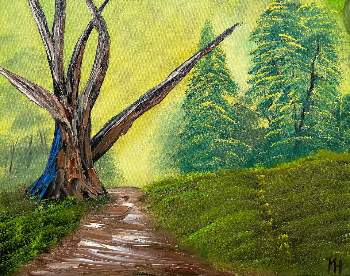 Here’s my cover of Bob Ross’ “Forest Edge”. I think I’m going to try this one again in the future, and stick more to what Bob did rather than improvise. Tried some alterations to the color that I thought I’d enjoy, but didn’t, but hey, that’s art. The bush gods weren’t with me either, so after scraping the right side down to canvas twice. I just decided on grass. I do like my big tree though.