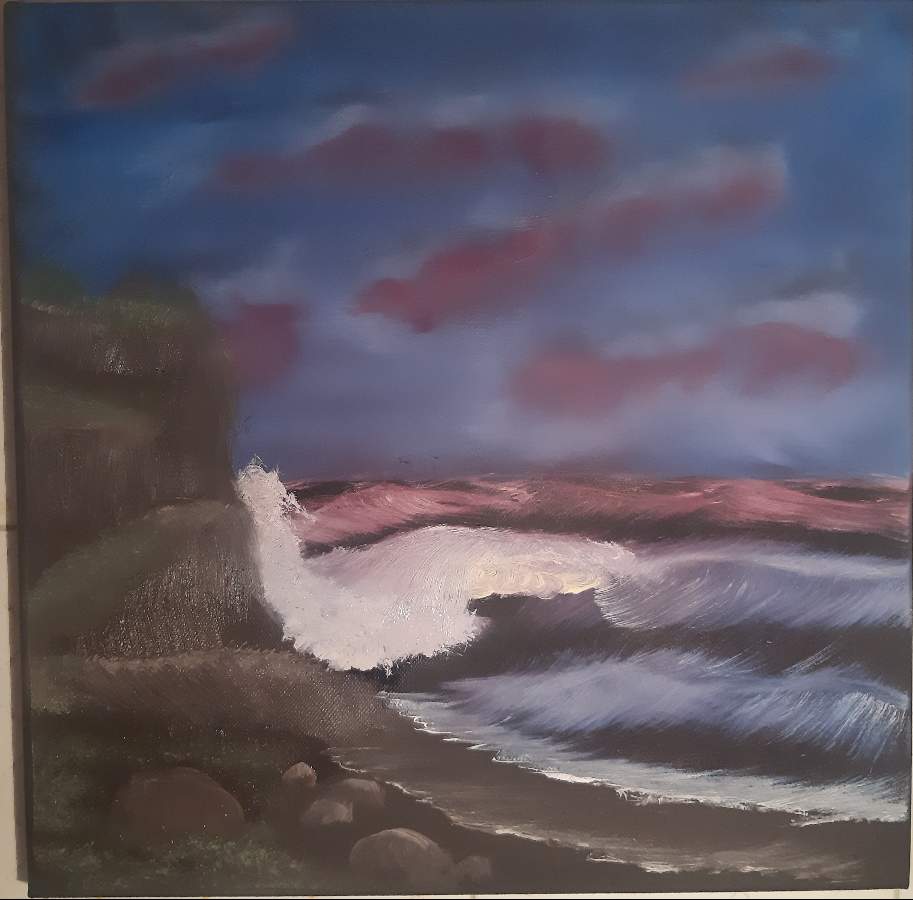 this is my first painting ever, it ended up pretty different form the Bob's one because I couldn't make the sky I think I put too much liquid clear or used too little paint in the sky and it blended to this lighter blue so I added some more normal clouds with some crimson on the bottom to have some sunset color. Then i wasn't liking the rock highlights so I decided to just put some grass on it. I will never be completely satisfied but I think it came out pretty good for being the first time i paint. Any tips for making the sky the way Bob did without it blending away immediately?