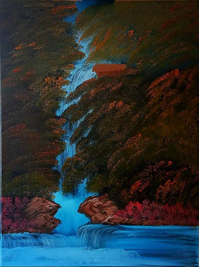 This is painting #38 on my Joy of Painting journey. I started out doing Graceful Waterfall but wasnt really digging it and decided that I wanted the waterfall to barely peek out through the leaves.