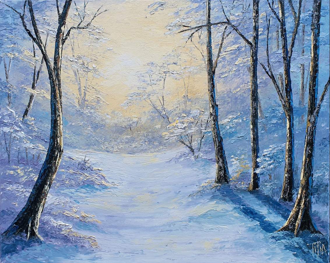 The colours are kinda based on the more detailed version of Bob's painting, in one of my books. Only my colours came out more to the purplish side, which is fine with me because I like the yellow/orange - purple/blue contrast. Especially in snowy winter scenes.
