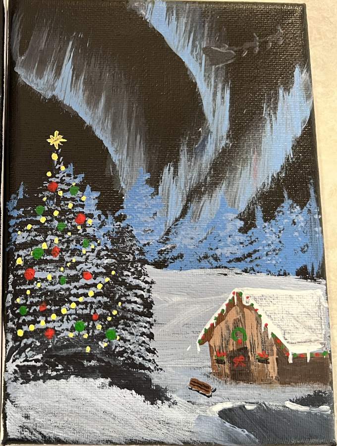 Did this in December and added some christmas flair to it so we can hang them every year. Fun painting, using acrylic we struggled to get the effect that bob does with the northern lights but had fun anyway!