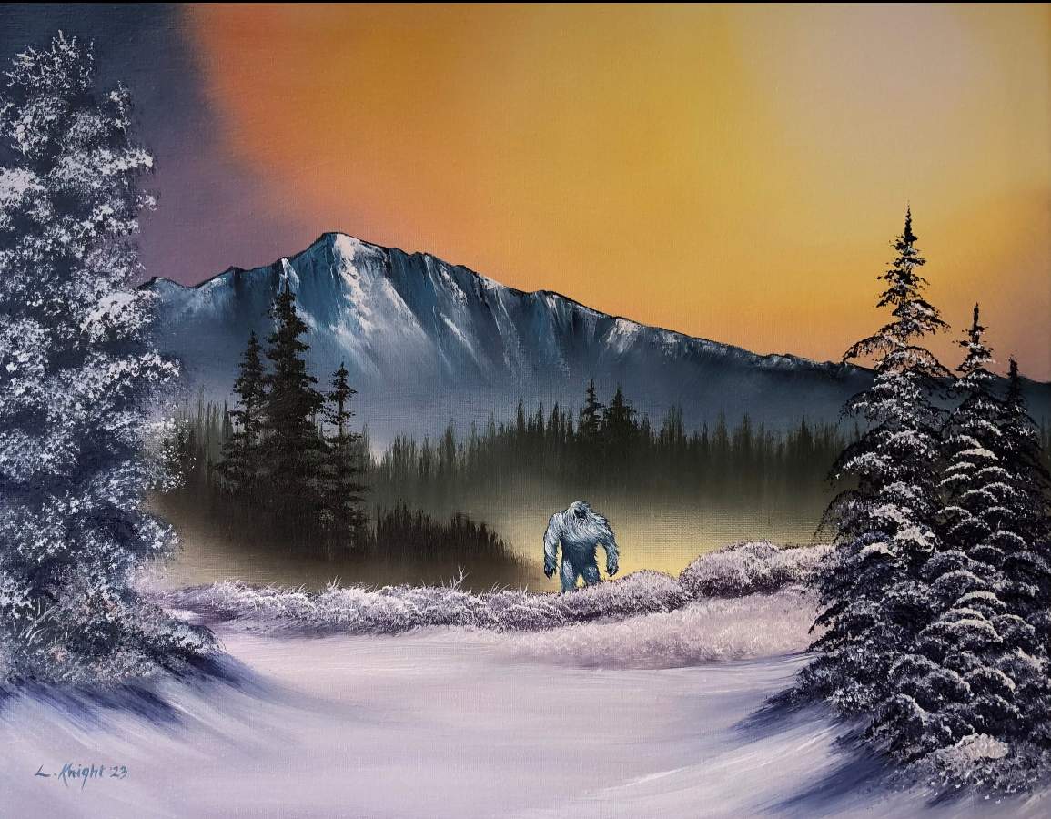 Instead of the one little scraggly tree on the right, I put in a row of dark bluish purple pine trees with the oval brush(my fav), making kind of a snow covered riverbed. I hope Bob would approve☺️