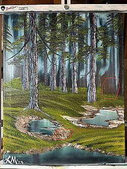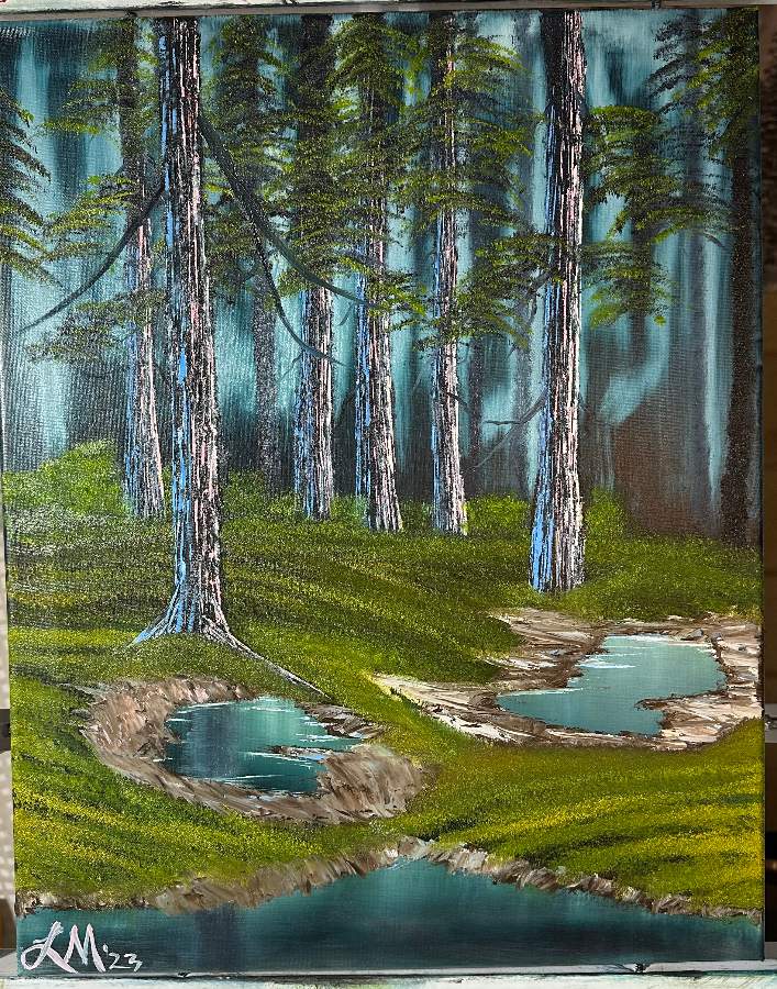 I really like this one! My daughter asked me if she could hang it in her room, so that felt good. Question for you all: I’m wondering what would happen if I tried to add some bushes. It’s completely dry at this point. The mud around my puddles feels too wide, especially compared to the pond at the bottom. I’m wondering if I can cover up some of the puddle edges so the dirt isn’t so sprawling. Also, thinking about adding a few bushes to the background as well. I’ll try to post a second picture with the spots circled. I haven’t ever tried adding to a painting after it’s dry so wondering if I might make a complete mess.