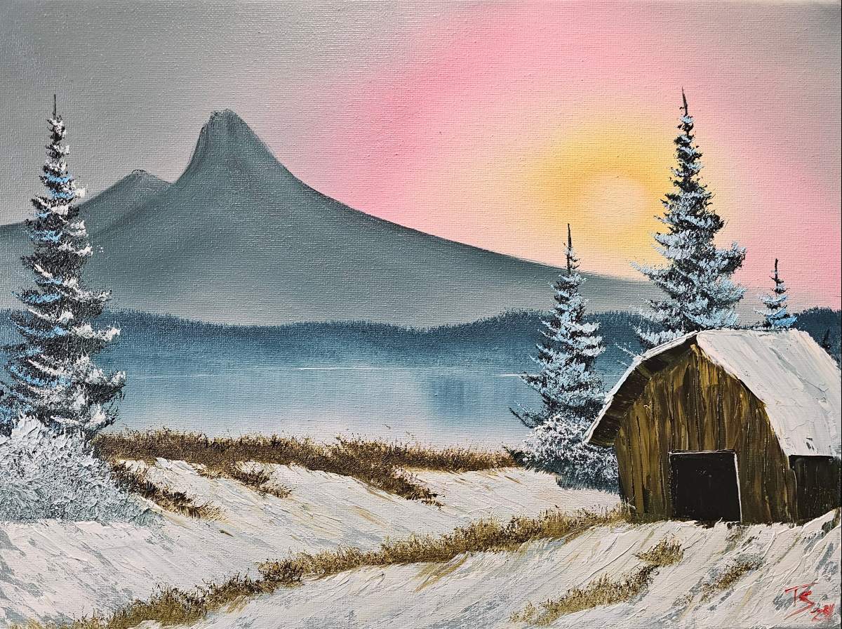 Looks great overall, including the barn. I especially like the evergreens, foreground snow slopes, and grasses.