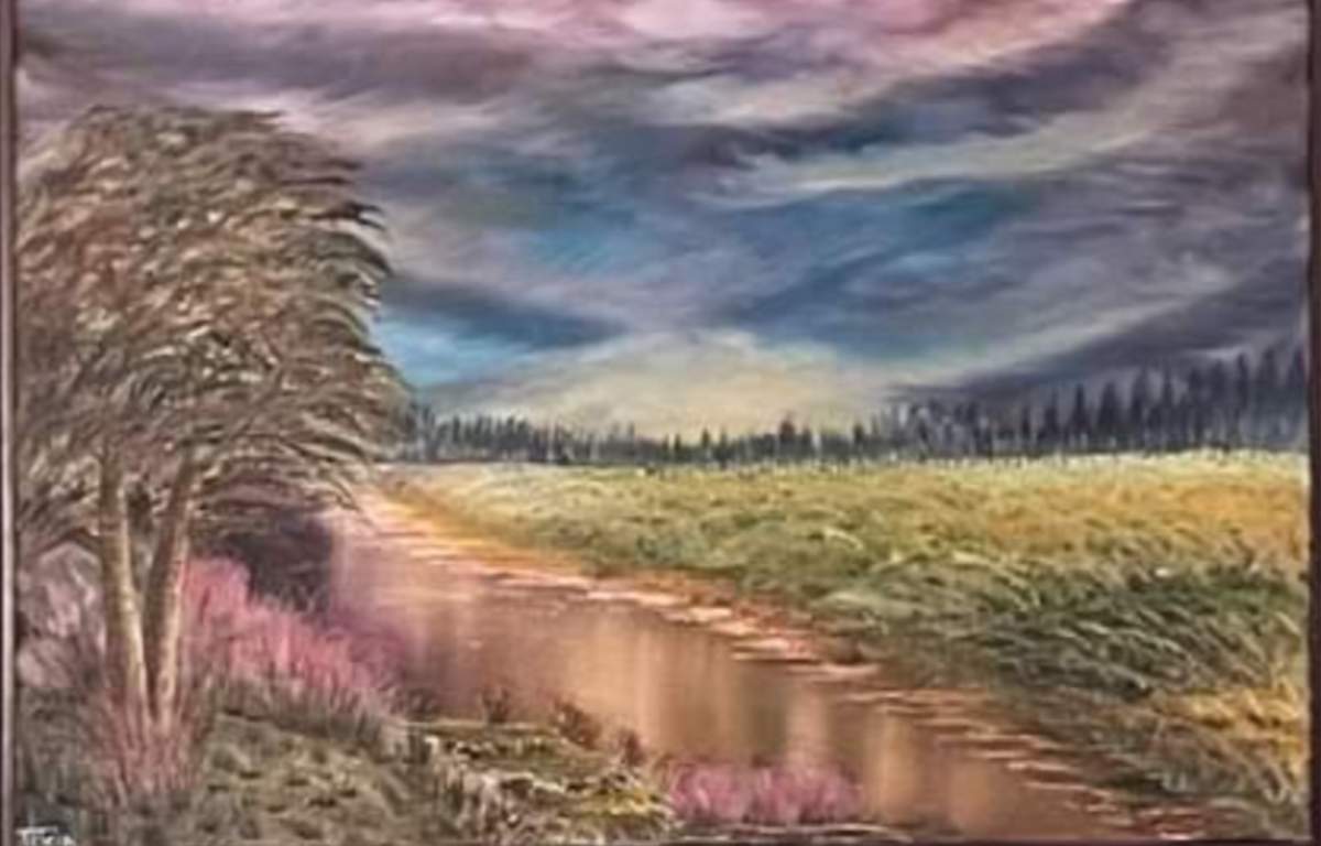 I loved the sky. It was a heart pounding new experience. Bob said go crazy. I was like. Well WTH...ok.. I did. It was amazing to feel the freedom of that brush. I love this one. It sold for 250$. I left the cabin out. I felt it took away from that sunset. I calline Ohio Sunset. It was entered in 2 events. But had sold prior to those. It hung in my home for a year before I found a frame. It's 24 x 36 inches. Oil on 1/2 inch canvas. Wish I could duplicate it. But it's gone.....Cherry frame. It's brighter in person. How to get good photos?