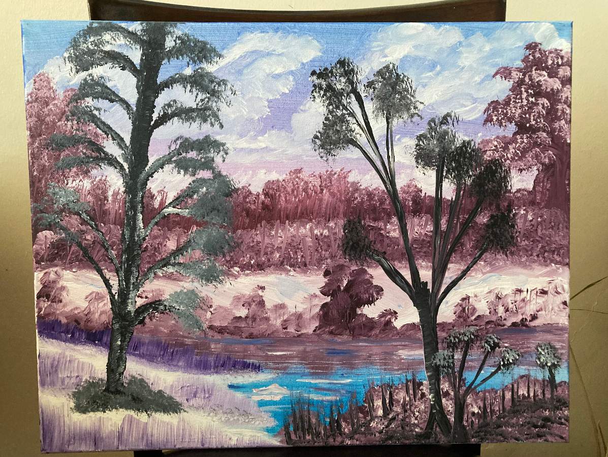 My version of 'Winter Lace' painted in acrylic paints, used just the basic 5 colors red, yellow, blue, white and black.