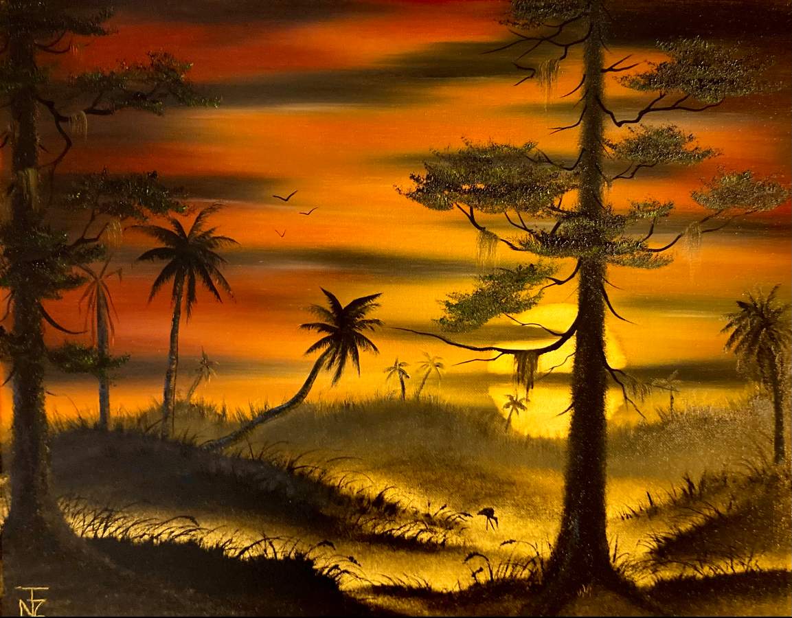 I didnβt do this one on a dry canvas. I put some liquid clear to help out since I was getting very poor results. I also change my scene for a tropical/swamp-ish one. Super fun painting to do. Very different concept.