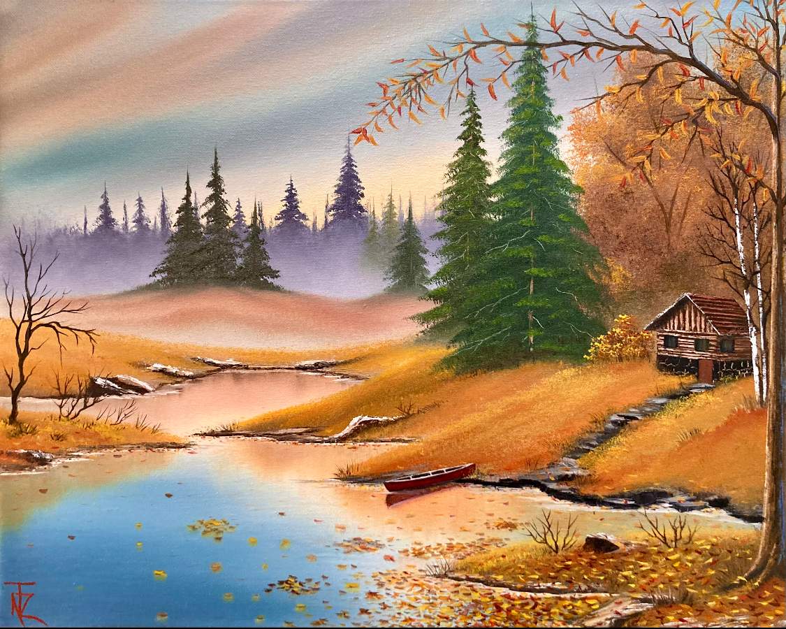 I added a canoe and lots of fallen autumn leaves in the water and that little peninsula on the bottom right.