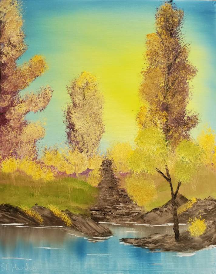 Nice. Your banks look like wet clay, I really like that. Pull back a bit with your highlighting, have a lot of paint on your brush but hardly touch the canvas. Because Bob works fast it looks like he's smashing it in but he's not. Try this and your highlights will improve faster. Avoid the first few series to begin with, Bob explains things more fully later on which is better for a beginner. You're doing great.