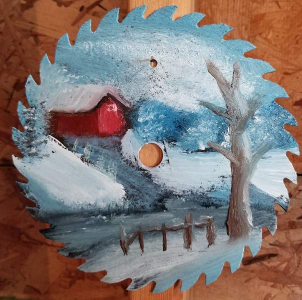 Second sawblade. Actually painted two at same time. Originally was going to do one as winter and one as summer, but lacked the confidence to follow through so figured would just complete as winter. P7.5