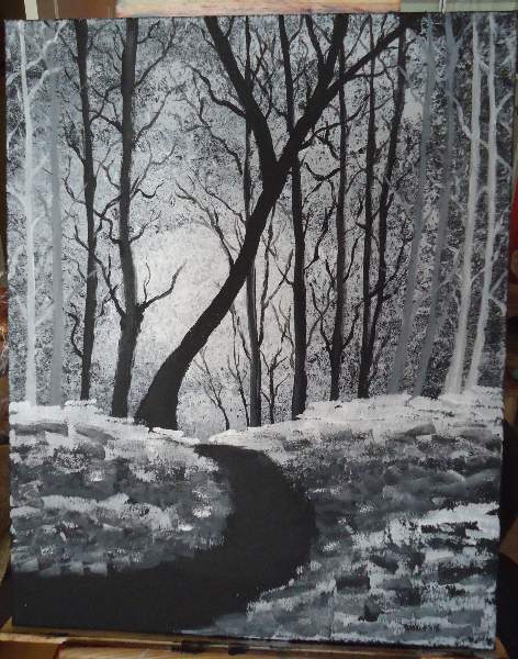 My 13th painting and the number was for sure NOT an unlucky one. I've been preparing this one for over a week and just had to wait until my ordered grey gesso was delivered, which happened today. So I took the black (earlier prepared) canvas (20"x24"), three gessos, a foam brush and a script liner. About two hours later, the painting was finished in black & white. Everybody at home loved it yet … I wanted to go further for the coloured version (see that one next). For now, just posting the B&W version, however without the sun and the rays accentuated which would have shown a much stronger effect.