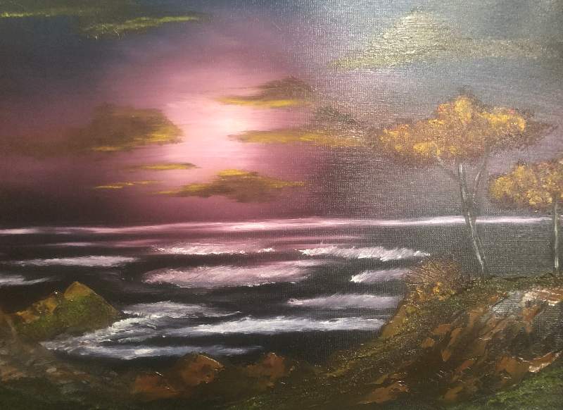 The hazy, pink light in the sky is very effective and sets a wonderful mood for the whole painting. Nicely done!