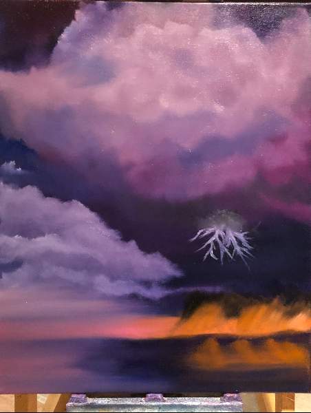 The clouds directly around the lightning need a lighter shade. You can use less lightning but make them longer, towards the ground, and as thin as possible but with a very zig zag effect. Hope this makes sence!