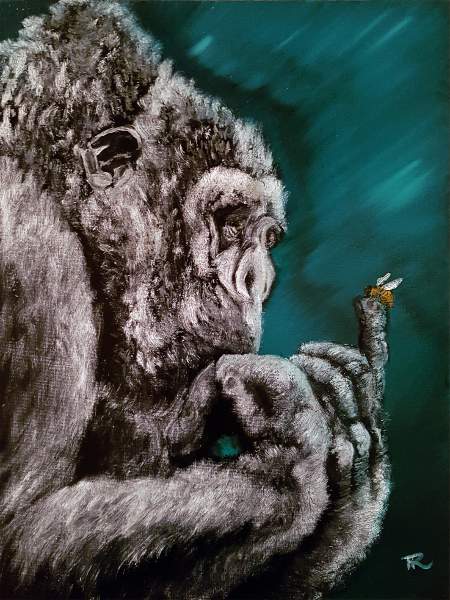I've recently discovered my inner appreciation of these amazing creatures, capable of ripping your head off if they feel threatened, they choose to be gentle. I've seen them display a fascination with smaller and more vulnerable creatures including humans. I think your painting shows that brilliantly as I get the sense he is protective of the bee. A healthy respect of the gorilla is required but I would definitely welcome him by my side if I were in a fight with a lion! A lovely and intriguing painting.