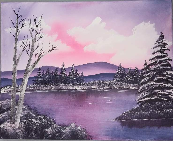 This was a fun painting to do. I wet the canvas on the back with water constantly to keep the acrylic paint from drying too fast. The mountains in the back were an easy part to paint compared to other mountains. It is my daughters favourite.