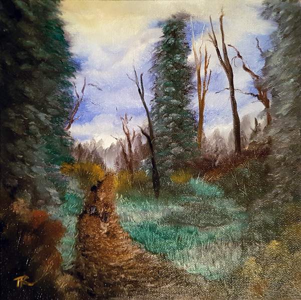 Quick adapted painting of Bob Ross's Morning Walk, with two childen playing along the path. The wood is reminiscent of some there are around my home town.