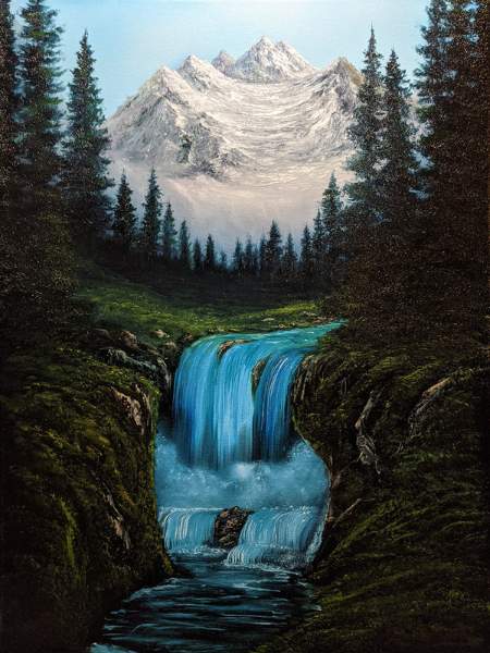 Man do I ever know that feeling! The desire to just scrap the painting, open the window, and toss the canvas out is something I am familiar with. I am glad you persevered because this is a great painting. I love the dark grassy areas and the waterfall. Funny enough, I've had a canvas prepped with black gesso trees for weeks now, intending to paint this exact painting. I haven't pulled the trigger yet. Perhaps you have inspired me to do so! Great work here, yet again.