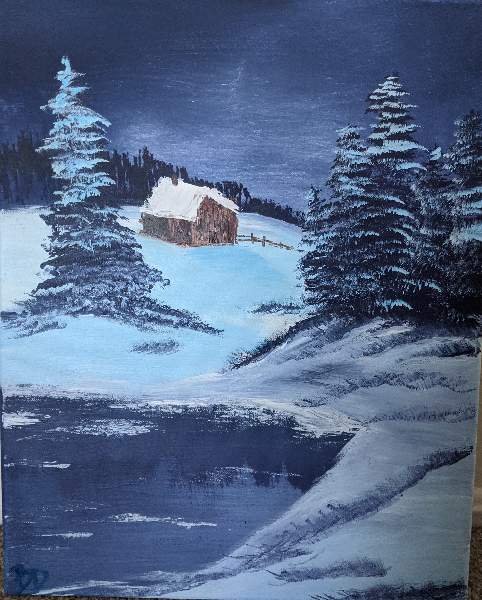 My favorite part of this painting was doing the cabin. It was my first time painting a cabin and I like how it came out!