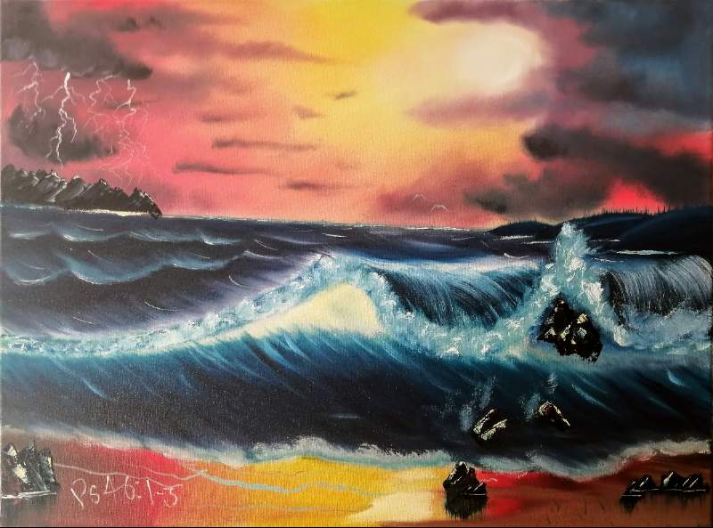 Added a bit of lightning and background mountains and a happy accident double crashing wave
