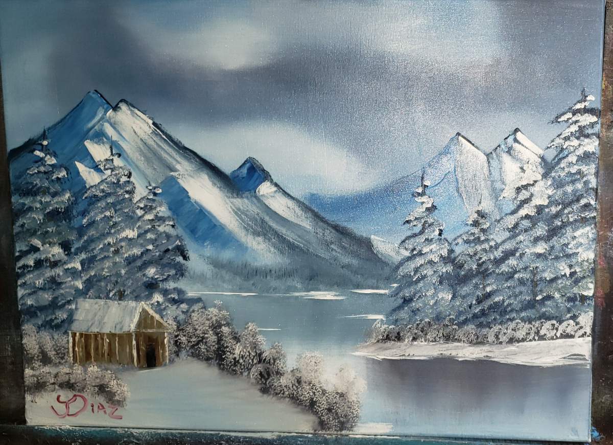 Trying to get more details in my mountains. Cabins need a lot more practice as well. Im happy overall because I can't even draw a stick figure so it is not that bad.