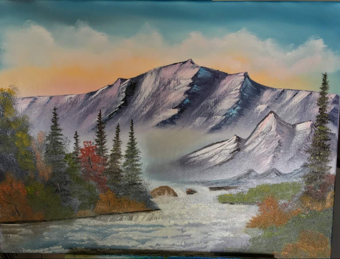 I thought I'd do this in an hour or so but boy did it take longer than that. I just couldn't get that mountain / those mountains right. Once again the composition of my foreground isn't "right". I think I should've skipped painting the riverbank on the left side. Needless to say, it was a lot of fun. I'm feeling my evergreens are getting slightly better and I'm getting more confident with the knife.