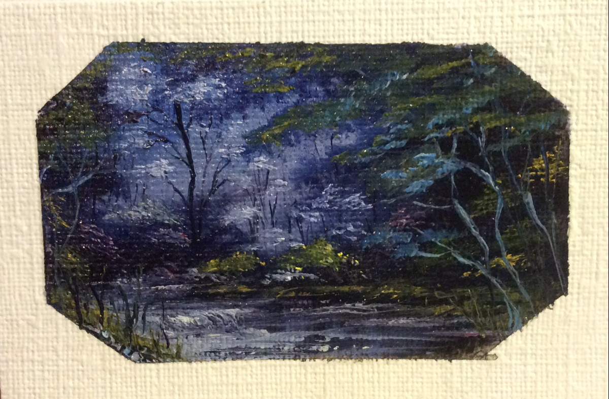 This 2”x3” black canvas has proved darker to photograph than it was to actually paint, I hope you can make it out! I’ll have another go at photographing & uploading again in daylight, but here it is for now.
