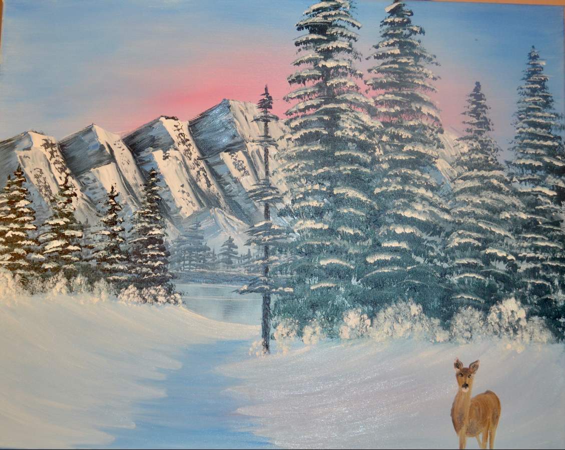 it is a winter day, a new snow covering, fun painting, mountains are too boxy, need to make my mountains more unique. the deer came out of the woods to say hi.