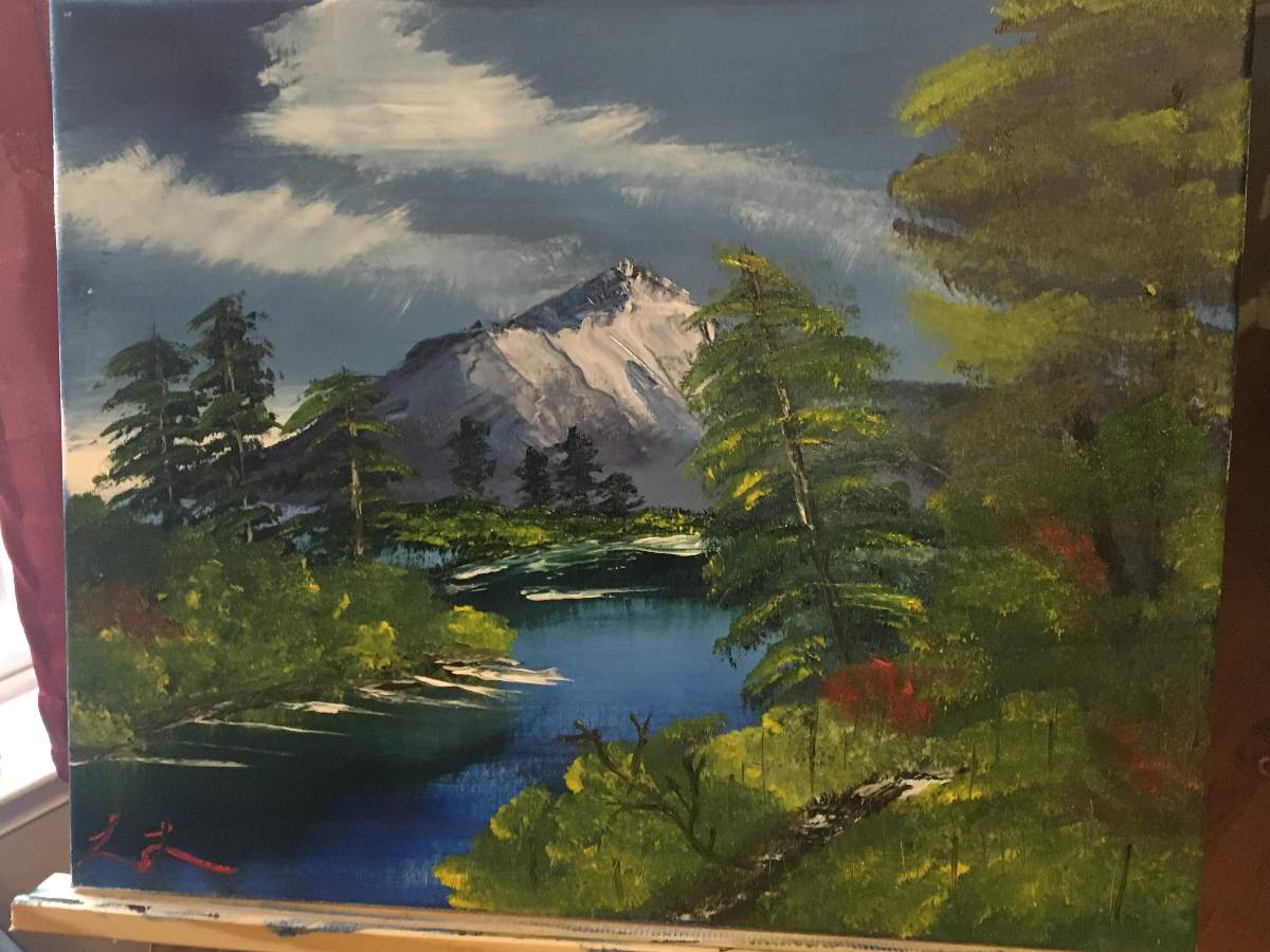 First Bob Ross painting, and actually first time painting anything. I really was shocked how well it went, though I struggle with clouds. I also couldn’t work the knife well. I used gesso instead of liquid white because I thought they were the same thing.