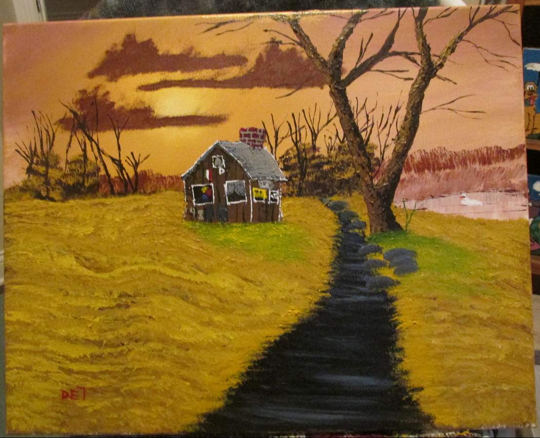 Painted on a 20 x 16 canvas. I decided to add some special little things to this painting. Named Golden KNOLL reminded me of a legendary football. So I added some stones making the path ROCKY, I added some GREENE not to be mean, I added some GREENWOOD, and I added a SWANN. The cabin has some special curtains, a WHITE D, a HOLME in the window, and a SHELL in another window. The cabin has a towel that is in terrible shape. Plus some other fun little things. I did have fun painting this one.