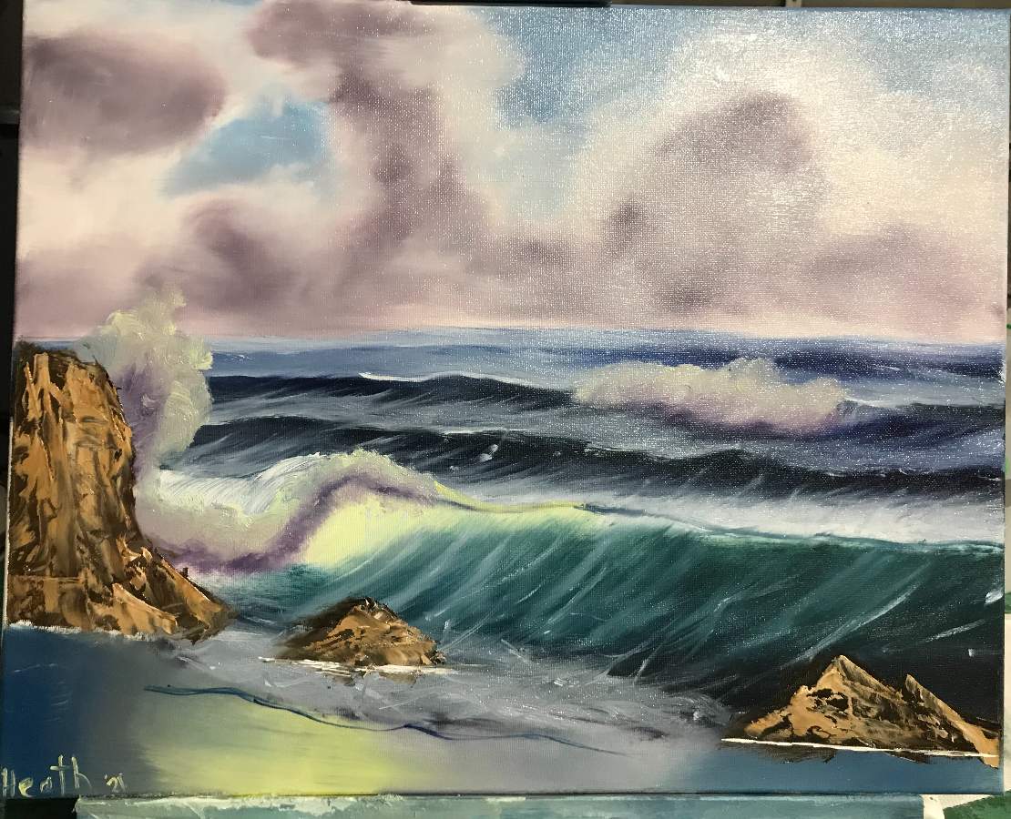 Seventh Ross painting. I am floored with how how this came together all at once at the end. I “piddled” an awful lot trying to get it right on this one. Loved the sky. The beach/foam area was challenging. I like my small rocks better than the big one!