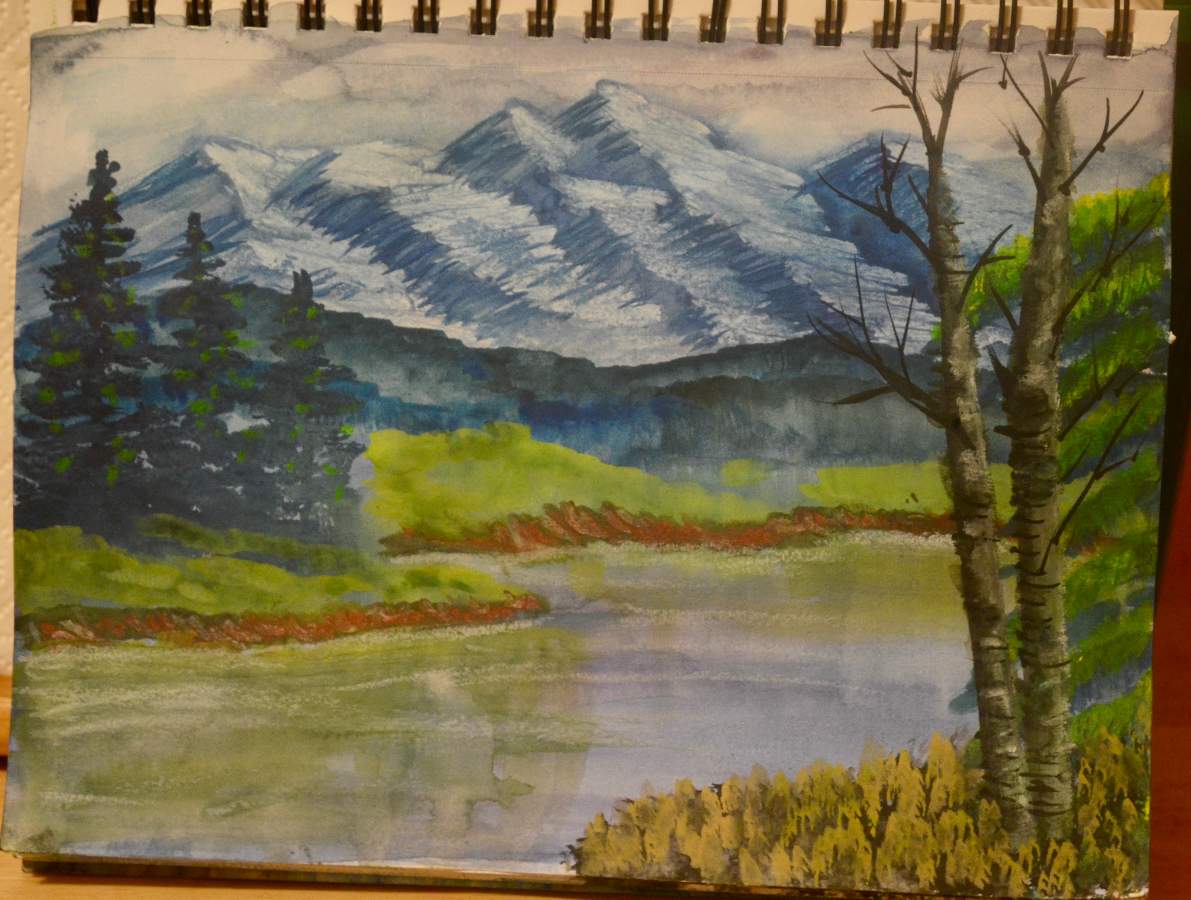 small watercolor, 7" X10", I used watercolor cakes, and watercolor crayons. Having fun using other mediums .