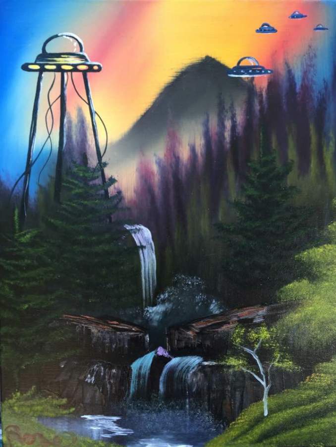Brilliant! I love how seamlessly you wove the alien machines into the peace and solitude of the Bob Ross landscape. Nicely done!