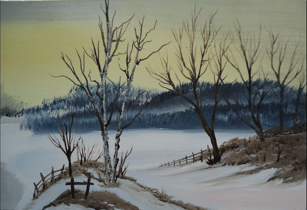 To suit the trilogy, a different sky coloring was used then Bob's original. I opted for two birch trees up front to create some variety between the trees. Fences and grass were real fun to do!