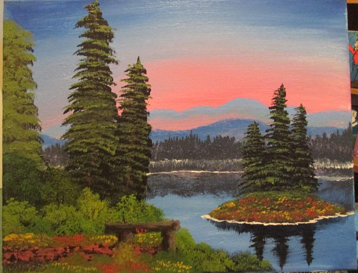 Painted on a 20 x 16 canvas. This is a repaint because my initials were too big and I did not like the look of the bushes. I like this one better, but I wish the bench was more realistic.