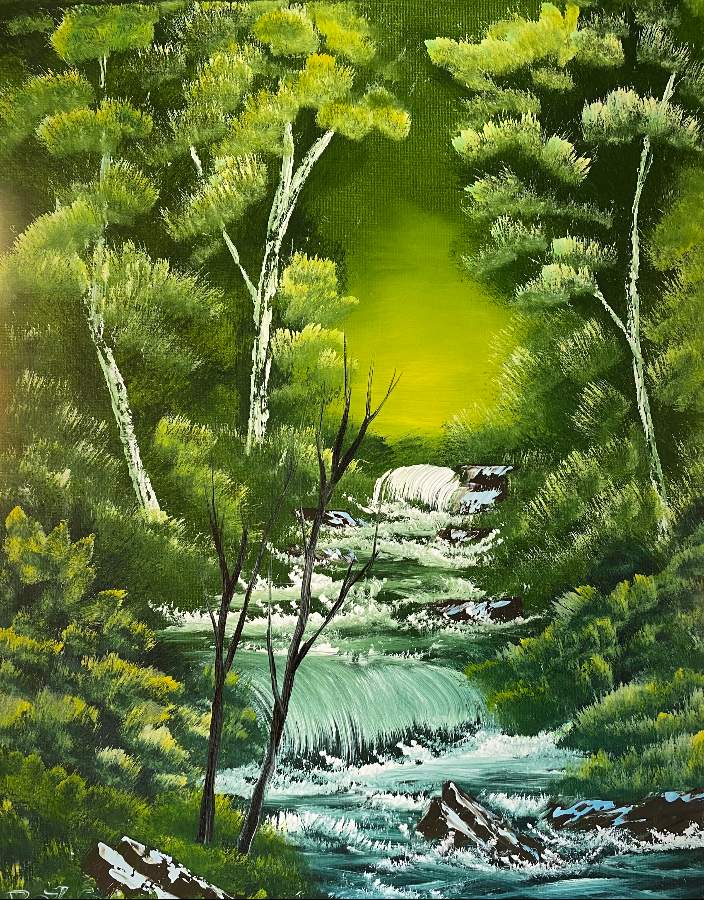 I love the colours here, and the stream, the water, fast rushing beautiful rocks, you have done this one really well. I like the bare trees in the foreground too. :)