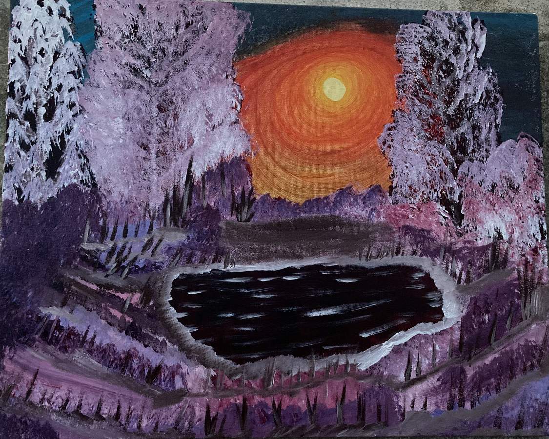 My version of “winter sun” did not turn out how I wanted it to but I love it. I tried some new acrylic paints a purple that picked up to use on some things else and used it instead of crimson. Let me know you think.