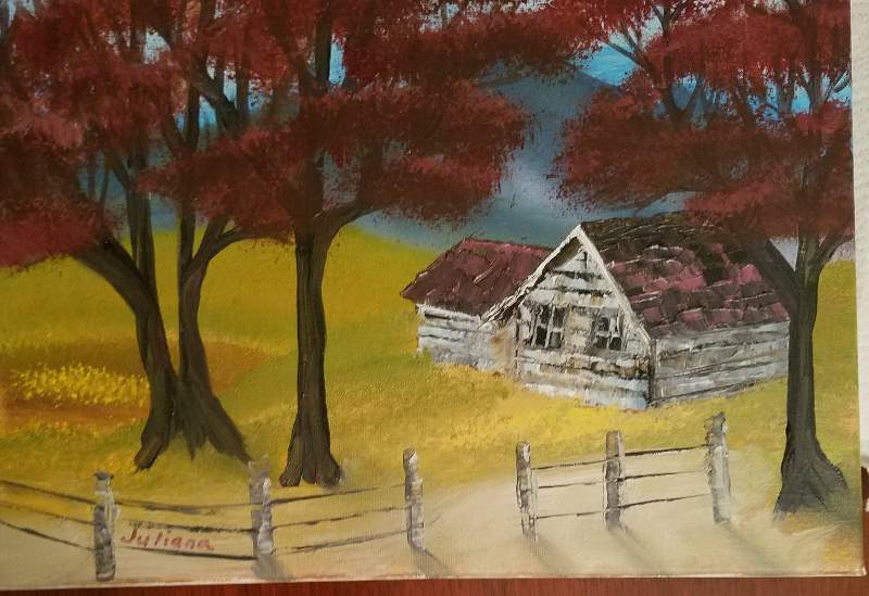 This is the same painting I uploaded before. I just put some leaves on the trees. I think it helped to cover up that one long, ugly limb, and the leaves match the little house. I think Little Red Riding Hood's grandmother lives there.